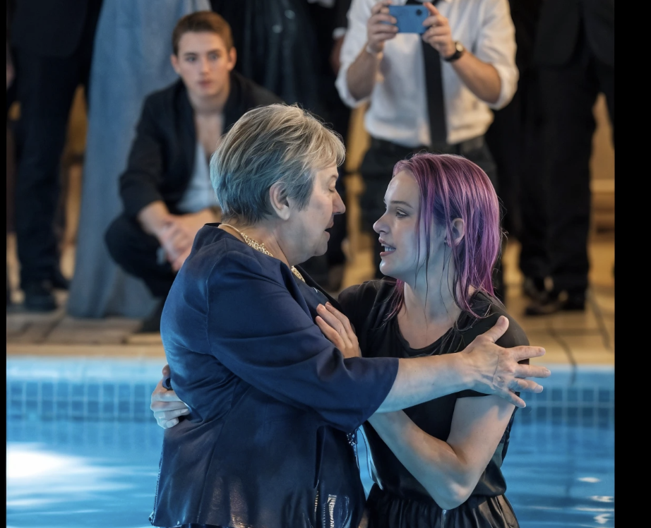 Guiding her toward the steps, Joyce helped the woman out of the water. Observing the resolved situation, some guests approached, offering towels. Inside the restroom, Joyce dried the lady’s hair with a hairdryer.