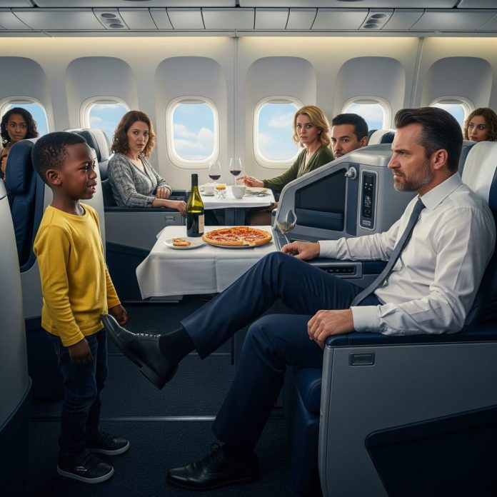 As the airplane filled with passengers preparing for departure, a young black boy named Marcus confidently walked down the aisle, his eyes scanning for seat 2A in first class. This was his initial long-distance journey alone, and excitement buzzed in the air. Marcus was eager to claim his prime spot and begin the trip.