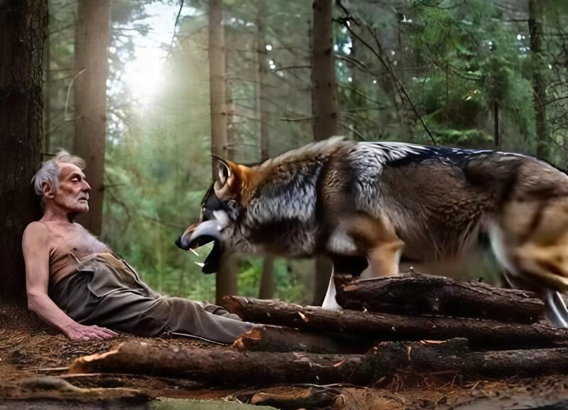 Minutes stretched into hours. Each time the old man dozed, the wolf’s presence lingered, steady and protective. When smaller predators prowled nearby, the wolf growled, driving them away. When the cold bit through his thin coat, the wolf pressed its body against his, sharing its warmth.