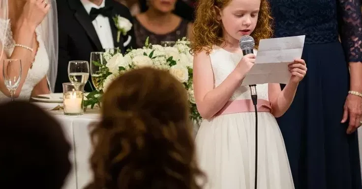 My eight-year-old daughter, in her pale pink flower girl dress, slipped off her chair. Her curls bounced as she walked to the stage, clutching something in her hand.