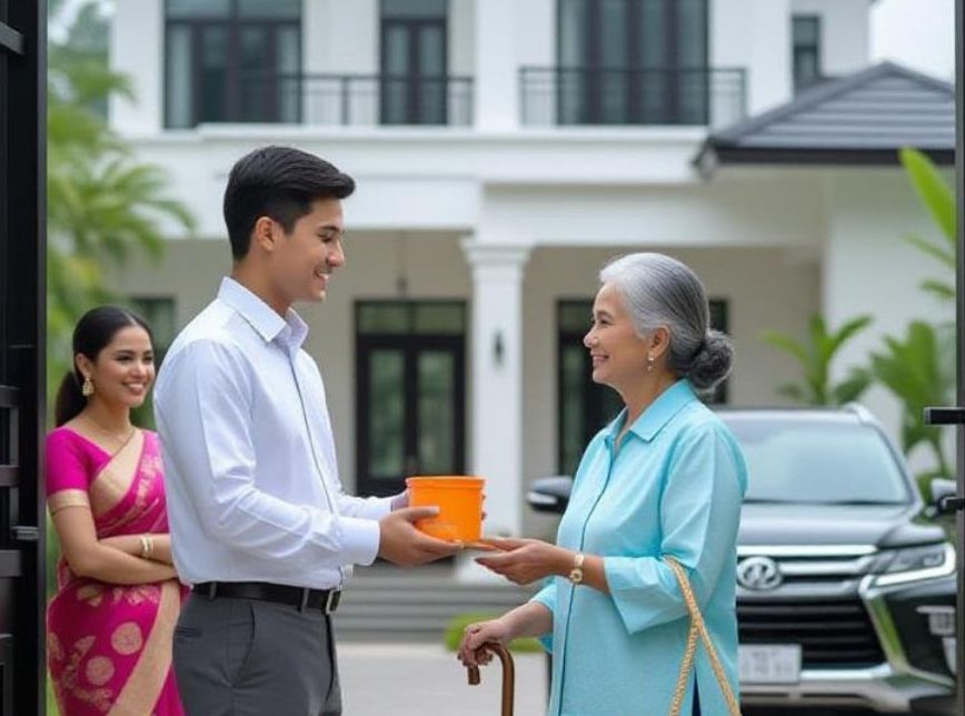 The gate opened, and Ramón’s wife appeared, immaculate in a white blouse and gold earrings. Her expression flickered with discomfort. “Nanay Dolores?” she said, half-whispering. “What are you doing here, in this weather?”