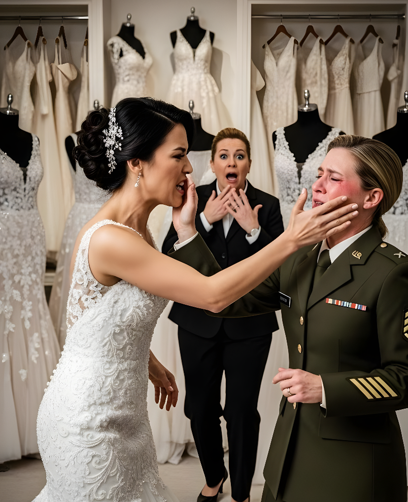 She turned back to the mirror, as if the slap never happened. I felt a burning flush rise to my cheeks but remained composed. My years of military service taught me to stay calm under pressure, though that didn’t ease the humiliation creeping beneath my skin. Eyes around me darted nervously, pretending not to witness the scene. The saleswoman fidgeted, and Mother averted her gaze toward bridesmaids’ gowns. No one spoke.