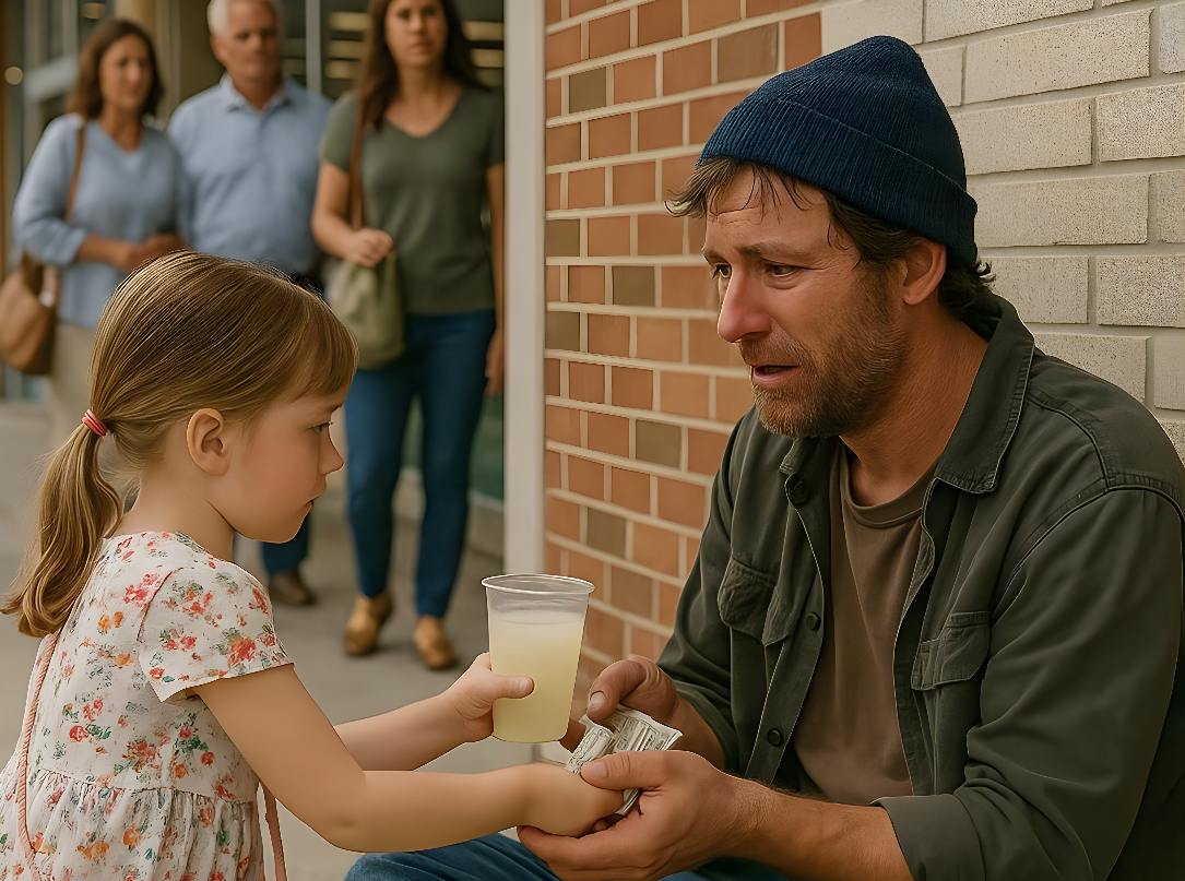 Before I could react, Lily trotted toward him, her small shoes slapping the pavement. “Hi, Mister,” she said brightly. “Don’t be sad. The sun’s out! You can share my lemonade if you want.”