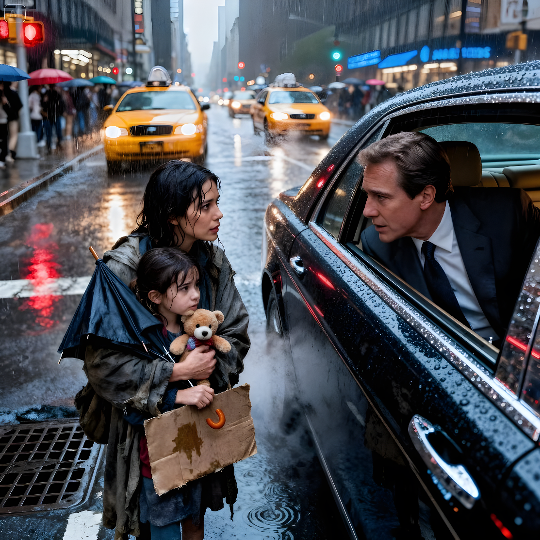 À un feu rouge, le regard d’Alexander se posa sur un visage qui détonnait dans l’environnement urbain. Sur le coin du trottoir, une jeune femme tenait un enfant contre elle, essayant de le protéger de la pluie battante avec son propre corps. Elle était vêtue d’un vieux manteau trempé ; ses bras frêles entouraient le petit avec une tendresse désespérée, à peine suffisante pour le préserver du froid. En l’observant dans le rétroviseur, une émotion inconnue commença à grandir en lui.
